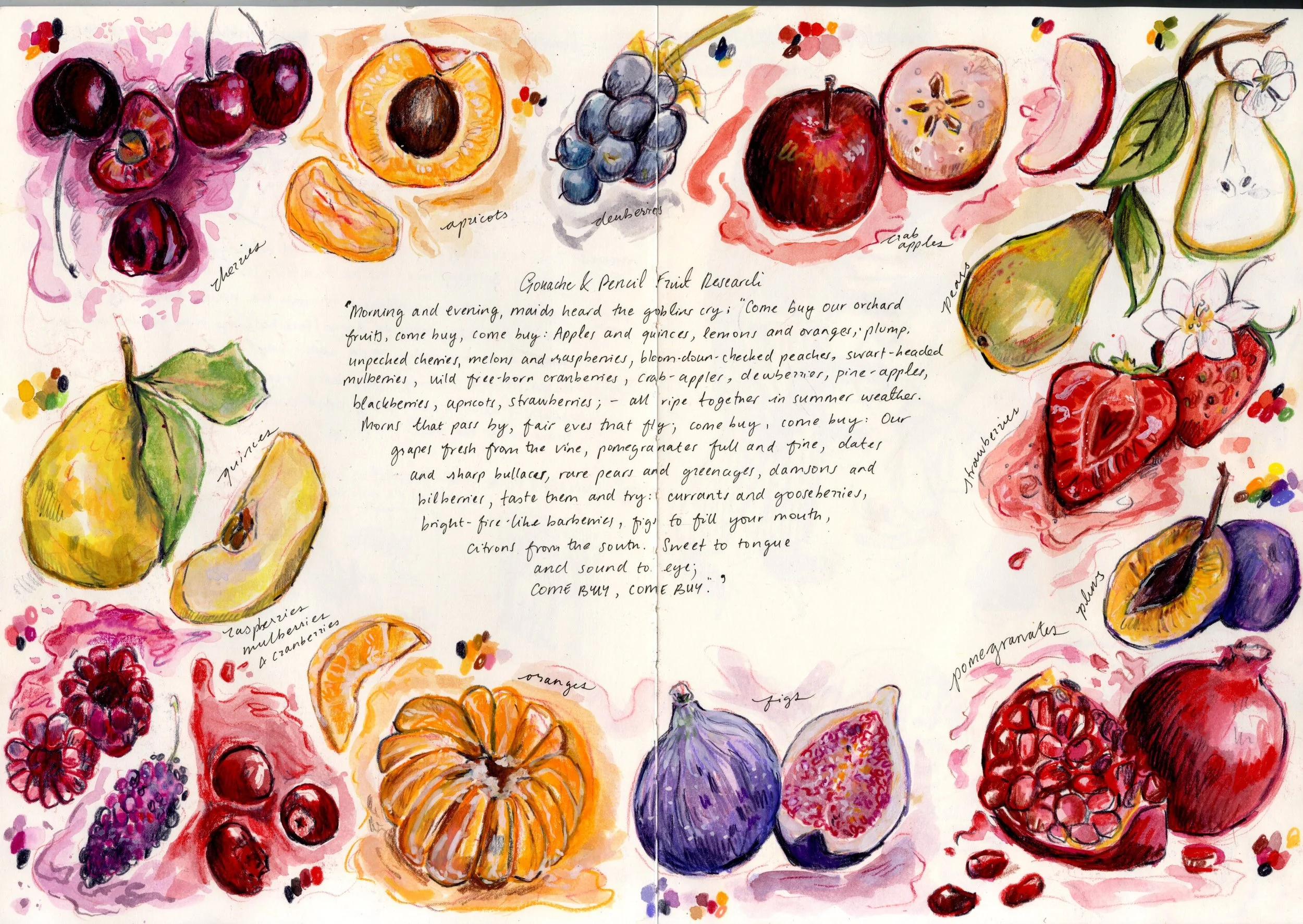 I’m drawn to narrative illustration and wanted to combine my love of the poem for its rich and vivid imagery of fruits, sisterly love and sinister goblins into a speculative Folio Society book cover.